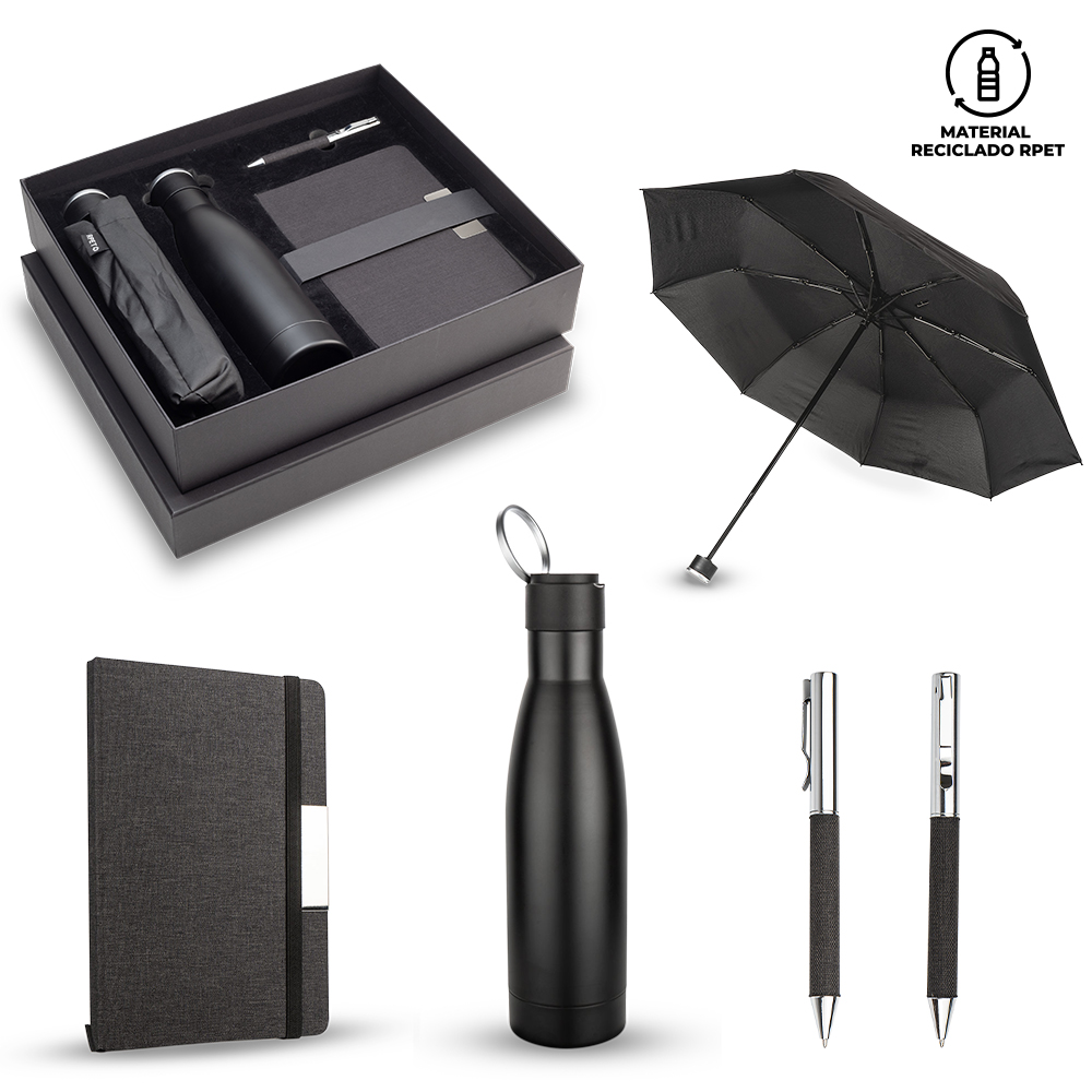 Medidas: Caja: 35cm x 31,5 cm. Botilito: 7cm x 26 cm. Libreta: 14,5 cm x 21 cm. Bolígrafo: 13 cm, Paraguas: 47 cm (18.5 pulgadas) x 8 cascos. Cobertura: 90 cm. Casco: 36 cm x 47 cm. .